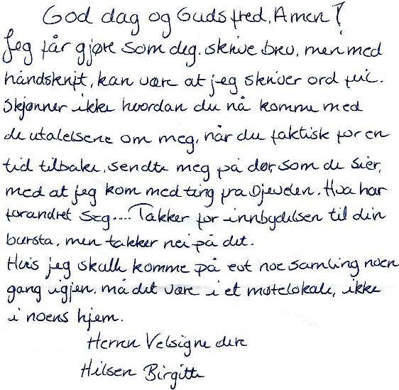 Videre i ditt brev sier du at jeg sa at du kom med ting fra djevelen, Jeg sa det, men det var uviselig av meg og si det på den måten, og jeg innrømmer det, og jeg har veldig vont over at jeg sa det på den måten, og jeg ber deg så inndelig om du vil være snill å tilgi meg... det at jeg sa det slik så ble det til en missoppfatning som jeg var skyld i, jeg skulle ikke sakt det slik jeg sa det, men vist du husker at rett før du forlot så presiserte jeg at vist du hadde en klage mot meg så skulle det ikke taes frem der under vår samling, og jeg husker at du leste opp noe fra profetordet som du målrettet til meg... Ikke profetordet, det var ikke målrettet til noen bestemt navngitt person, og i den henseende ble det galt og jeg sa det var djevelen. Men slik jeg sa det så var det feil og uviselig fremsatt av meg...