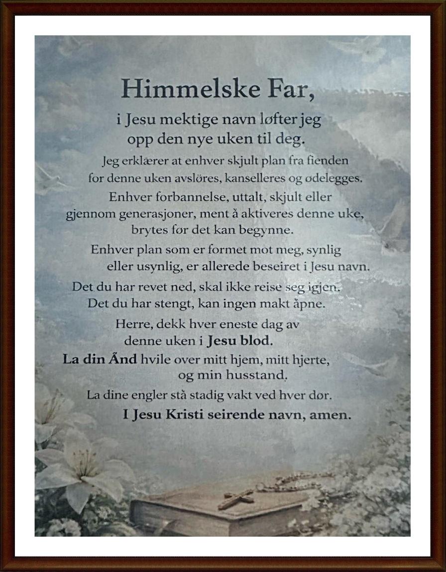 Himmelske Far, i Jesu mektige navn løfter jeg denne nye uken opp til deg. Jeg erklærer at enhver skjult plan fiendens har for denne uken er åpenbart, kansellert og ødelagt (Lukas 8,17).